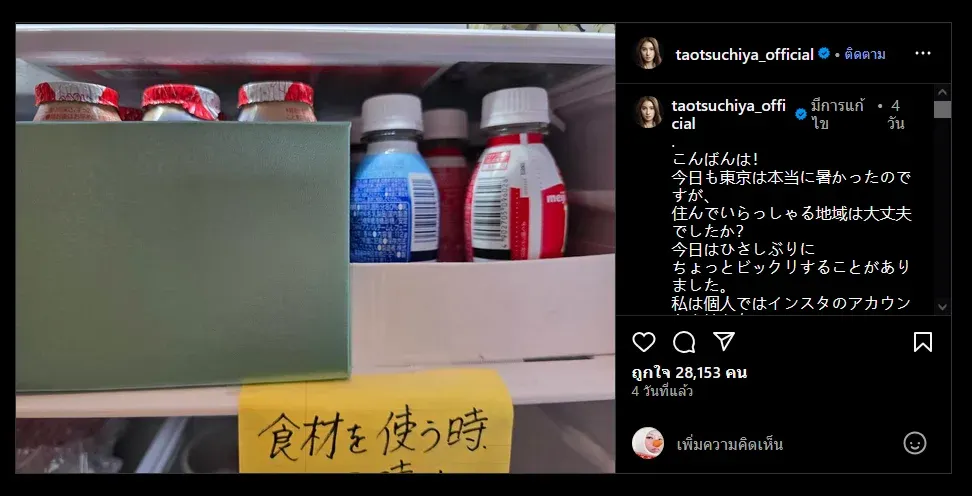 ซึ่งแทนที่ "ทาโอะ สึจิยะ" จะออกมาขอโทษ กับพฤติกรรมของตัวเอง แต่เธอดันโพสต์ภาพสินค้าแบบเดียวกับที่ลูกสาวของเธอเลีย พร้อมระบุว่า "วันนี้ที่โตเกียวร้อนอบอ้าวมากเลย ไม่ทราบว่าที่คุณอยู่ อากาศเป็นอย่างไรบ้าง?" และ "วันนี้ฉันเจอเรื่องที่ทำให้แปลกใจอยู่เล็กน้อย จริงๆฉันไม่ได้มีอินสตาแกรมส่วนตัว เลยไม่ค่อยได้ตามเรื่องเองนัก แต่ก็ยิ่งทำให้รู้สึกว่า ในยุคนี้มีเรื่องราวไม่คาดคิดเกิดขึ้นได้เสมอ" และ "ในชีวิตก็มีเหตุการณ์ต่างๆ ให้เราเรียนรู้อยู่ตลอดเวลา" และ "ตอนนี้ฉันเลยตัดสินใจเปลี่ยนมือถือใหม่ หลังจากใช้เครื่องเดิมมาหลายปี พอได้ลองใช้ก็ทึ่งกับความก้าวหน้า ของฟังก์ชันต่างๆช่วงนี้ ฉันก็ได้ยินเรื่องชวนให้ระแวงจากรอบๆตัวบ่อยขึ้น ก็ยิ่งเตือนใจให้ต้องดูแลความปลอดภัย ทั้งในเรื่องส่วนตัวและเรื่องอื่นๆ ขอบคุณมากๆ สำหรับทุกความห่วงใยที่ส่งมาให้นะ" และ "ทุกครั้งที่เปิดตู้เย็นในหน้าร้อน ก็ทำให้ฉันรู้สึกได้เลยว่า นี่แหละ... กลิ่นอายของวันหยุดฤดูร้อน!!"