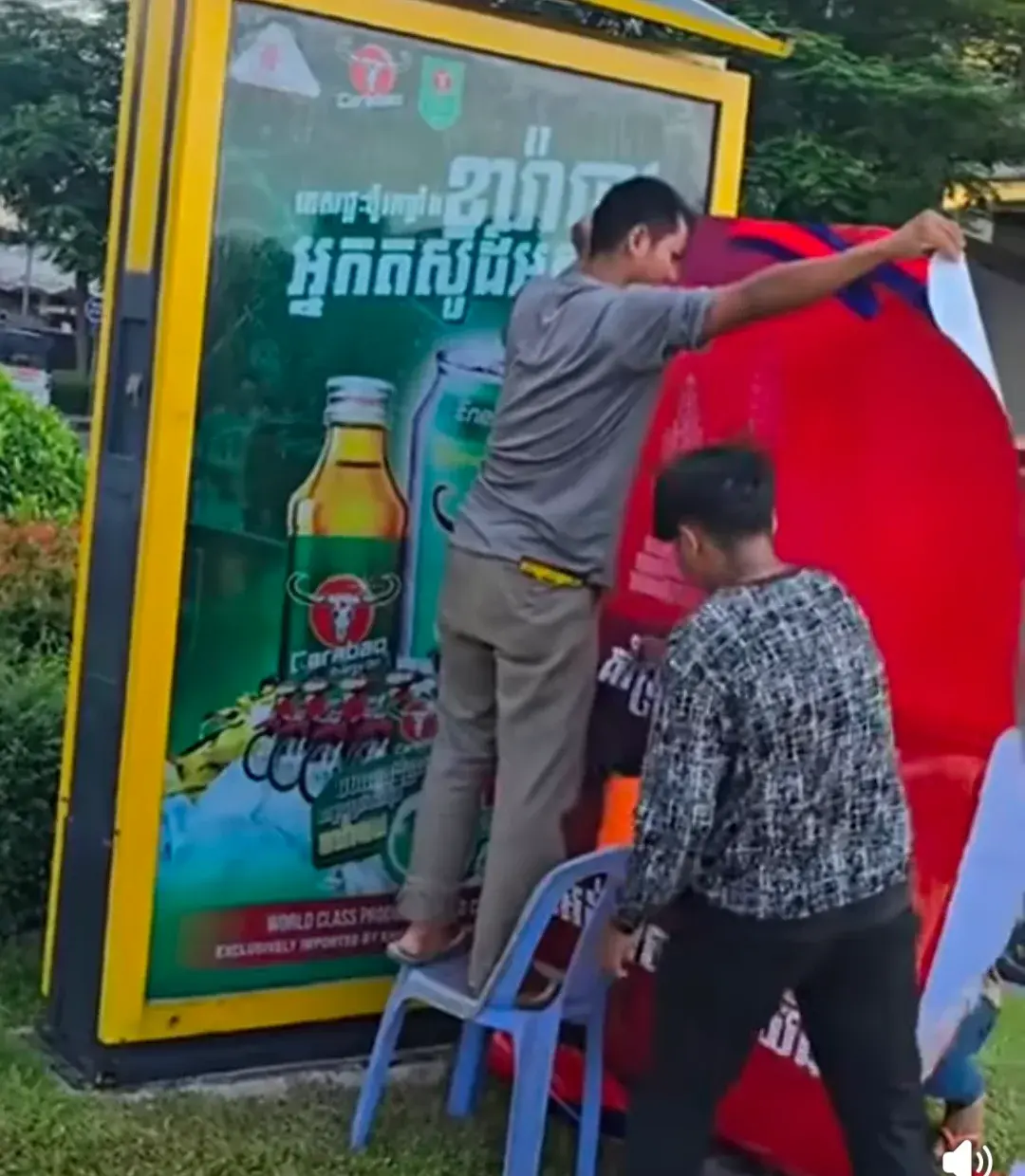 ชาวเขมรปิดป้ายที่มีสปอนเซอร์เสียม