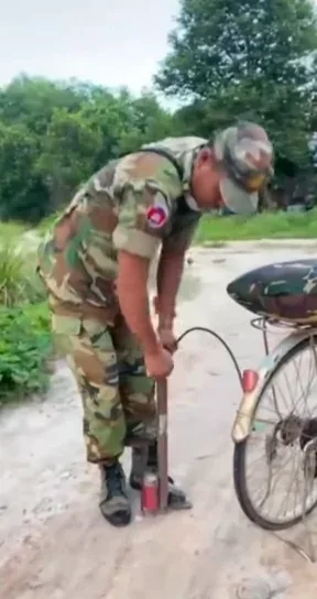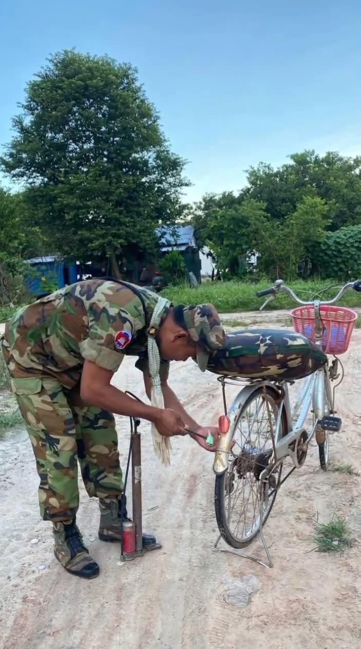 ทหารเขมรเติมลมยางจักรยาน ก่อนเดินทางไปที่ฐานในแนวหน้า ระยะทางห่างจากบ้าน 25 กิโลเมตร ชาวเน็ตไปสงสารได้ขี่แค่จักรยาน