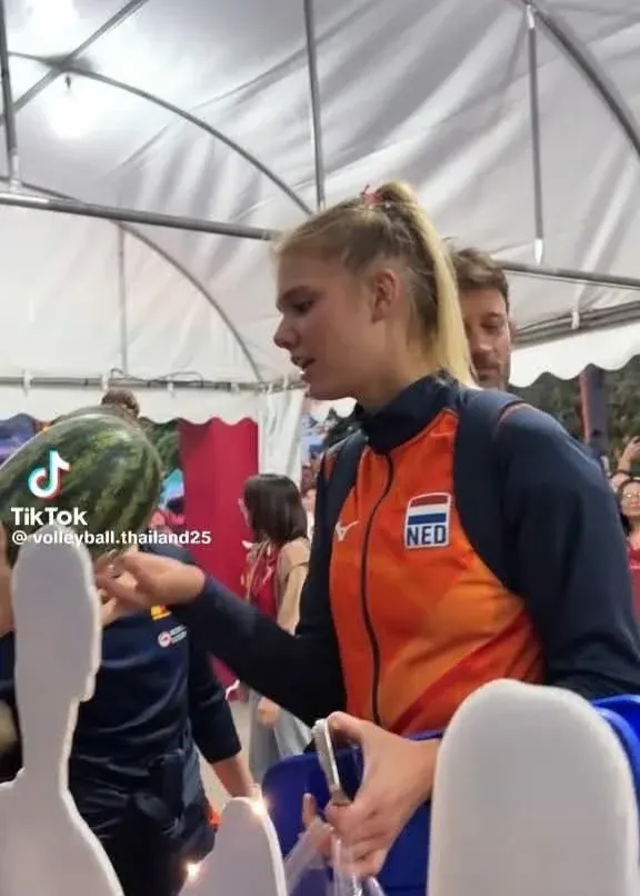 เรียกได้ว่าน่ารักไม่เบา สำหรับโมเมนต์อบอุ่นใจที่เกิดขึ้นหลังการแข่งขันวอลเลย์บอล เมื่อกองเชียร์ชาวไทยได้มอบ “แตงโม” ผลไม้ประจำหน้าร้อนของไทย ให้กับ Eline Timmerman นักตบสาวสวยจากทีมชาติเนเธอร์แลนด์ 🇳🇱
