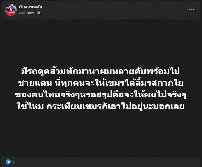 “มีรถดูดส้วมทักมาหาผมหลายคัน พร้อมไปชายแดน … นี่ทุกคนจะให้เขมรได้ลิ้มรสกากใยของคนไทยจริง ๆ เหรอ สรุปคือจะให้ผมไปจริง ๆ ใช่ไหม กระเทียมเขมรก็เอาไม่อยู่นะบอกเลย”