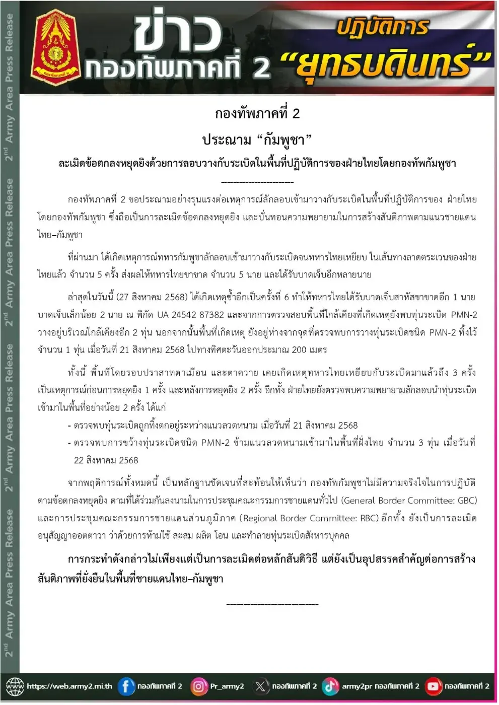 กองทัพภาคที่ 2 ประณาม “กัมพูชา” ละเมิดข้อตกลงหยุดยิงด้วยการลอบวางกับระเบิดในพื้นที่ปฏิบัติการของฝ่ายไทยโดยกองทัพกัมพูชา