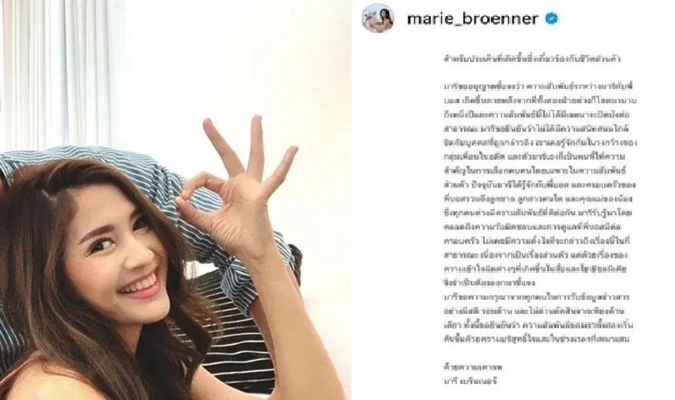 "มารี" ยอมรับแล้ว! คบ "ไฮโซบอส" จริง..แต่ในเวลาที่เหมาะสม ไม่ได้แย่งใคร โพสต์ครั้งแรกด้วยความบริสุทธิ์ใจ ฝ่ายชายเลิกรา "เชอรีน" เป็นปี ไม่ได้สนิทกับฝ่ายหญิงแต่รู้จักในกลุ่มของเพื่อนเก่า วอนสังคมอย่าตัดสินข้อมูลด้านเดียว