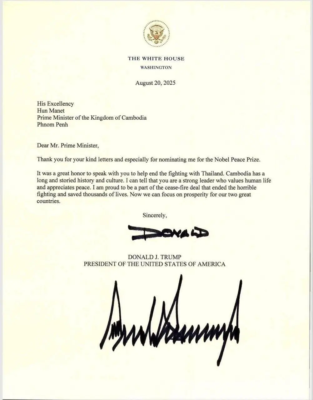 ฮุน มาเน็ต นายกฯกัมพูชา เพิ่งโพสต์จดหมายของทรัมป์ที่แสดงความขอบคุณ หลังจากกัมพูชาเสนอชื่อชิงรางวัลโนเบล สาขาสันติภาพ