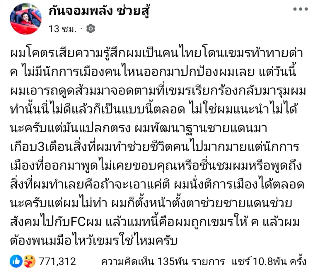 แล้วก็เป็นแบบนี้ตลอด ไม่ใช่ผมแนะนำไม่ได้นะครับแต่มันแปลกตรง ผมพัฒนาฐานชายแดนมาเกือบ3เดือนสิ่งที่ผมทำช่วยชีวิตคนไปมากมายแต่นักการเมืองที่ออกมาพูดไม่เคยขอบคุณหรือชื่นชมผมหรือพูดถึงสิ่งที่ผมทำเลยคือถ้าจะเอาแค่ติ ผมนั่งติการเมืองได้ตลอดนะครับแต่ผมไม่ทำ ผมก็ตั้งหน้าตั้งตาช่วยชายแดนช่วยสังคมไปกับFCผม แล้วแมทนี้คือผมถูกเขมรให้ ค แล้วผมต้องพนมมือไหว้เขมรใช่ไหมครับ