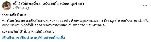 โพสต์ประกาศปิดกิจการจากเพจของร้าน ระบุข้อความว่า