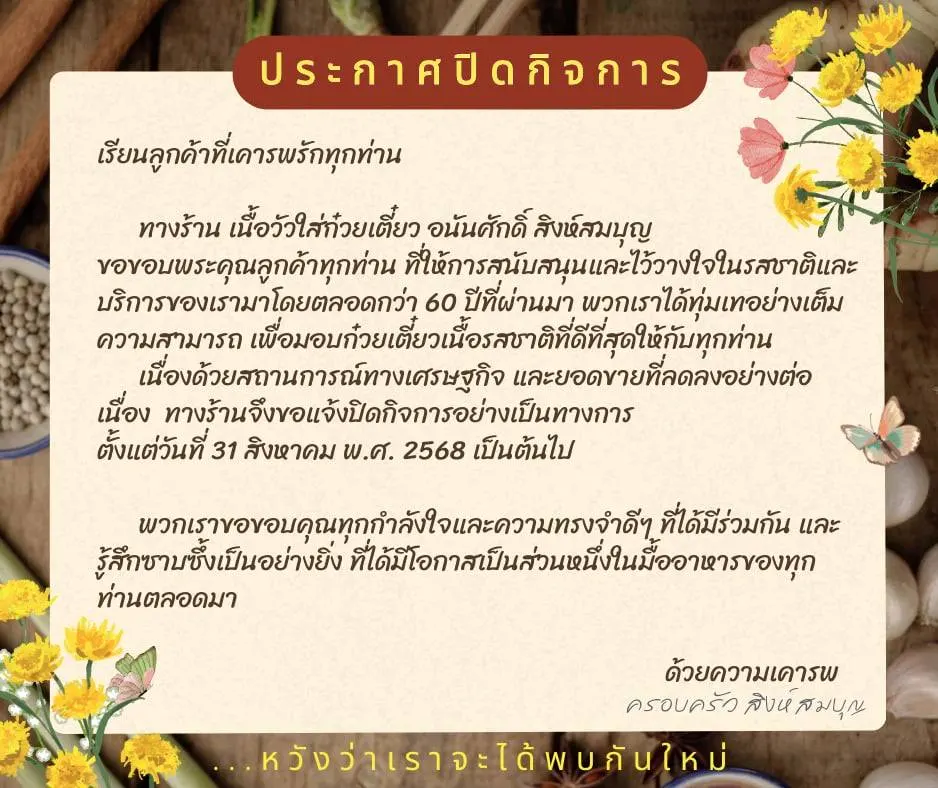 สะเทือนใจ! ร้านก๋วยเตี๋ยวเนื้อชื่อดัง ประกาศปิดถาวร 31 ส.ค. เหตุพิษเศรษฐกิจ