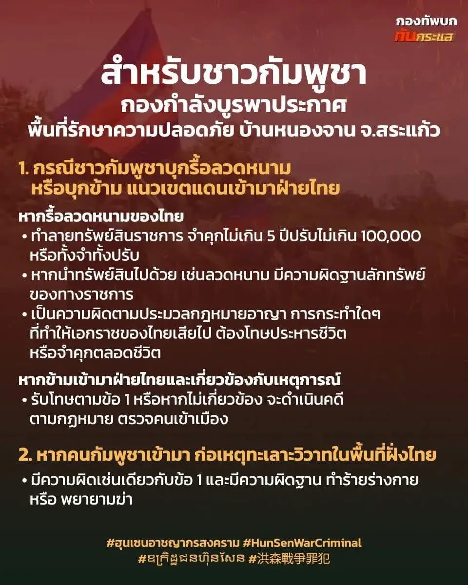 ล่าสุด กองกำลังบูรพา กางกฎหมายขู่เอาผิดชาวเขมร ละเมิดคำสั่ง กกล.บูรพา โดนคดีแน่ รื้อลวดหนาม-ทำลายทรัพย์สินราชการ ถ้าขโมยเอาลวดหนามไปด้วย โดนลักทรัพย์ของทางราชการ