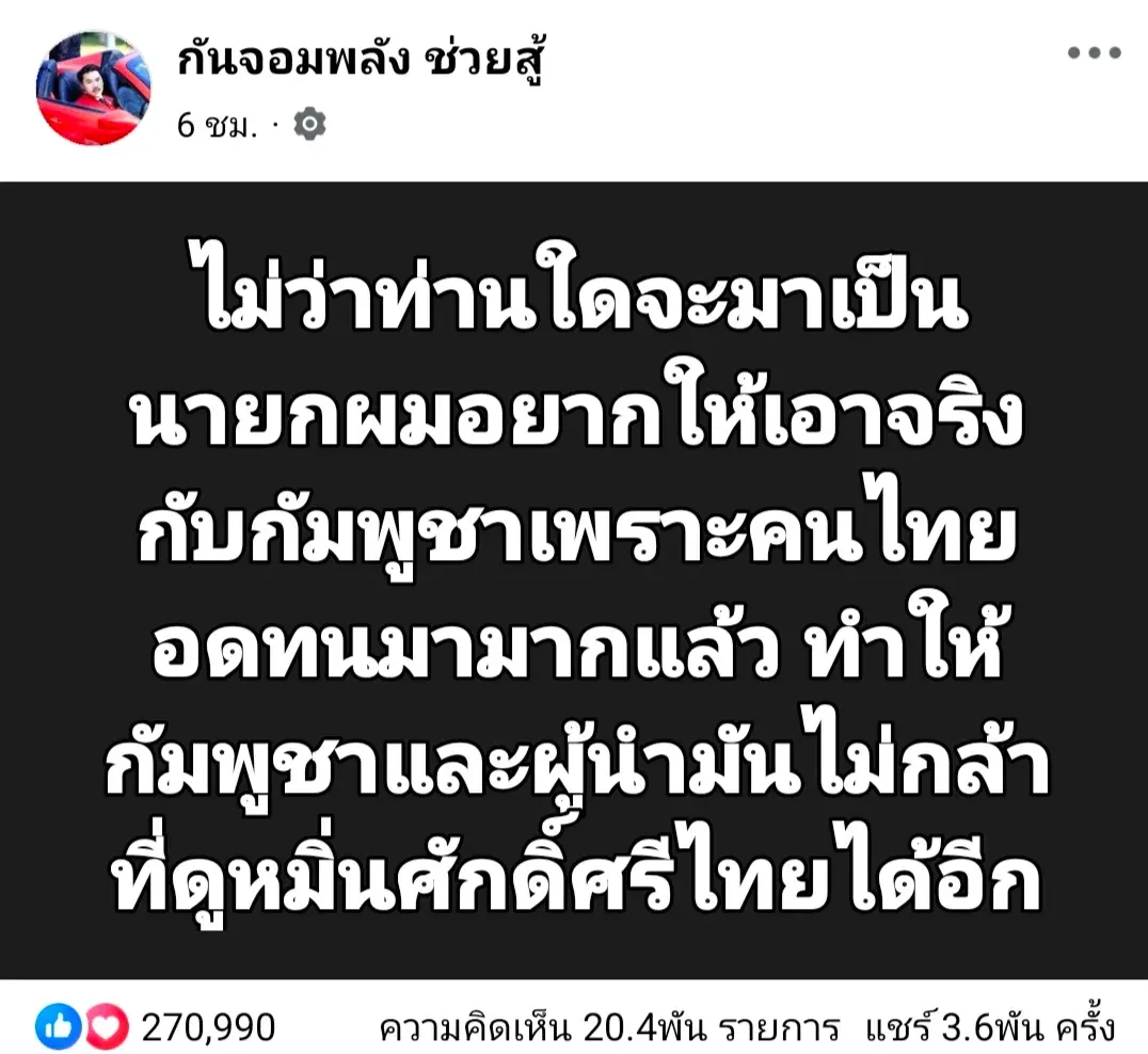 กันจอมพลังโพสต์ ไม่ว่าใครจะมาเป็นนายก อยากให้เอาจริงเอาจังกับกัมพูชาคนไทยอดทนมานานมากแล้ว