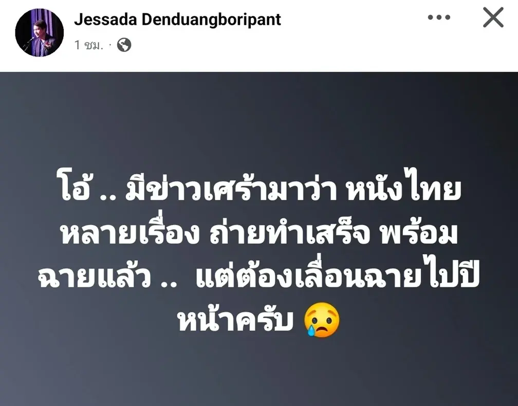 ข่าวเศร้าหนังไทย! ต้องเลื่อนฉายไปปีหน้า.."อ.เจษฎา" แจ้งข่าวให้ทราบ ทั้งนี้ก็คาดว่าน่าจะมีข่าวใหญ่ปลายปี แต่ยังไม่มีการยืนยันอย่างเป็นทางการ ทางด้าน รศ. ดร.เจษฎา เด่นดวงบริพันธ์ ซึ่งเป็นอาจารย์ประจำภาควิชาชีววิทยา คณะวิทยาศาสตร์ จุฬาลงกรณ์มหาวิทยาลัย ก็ได้โพสต์ข้อความผ่านทางเฟซบุ๊กส่วนตัว Jessada Denduangboripant เมื่อวันที่ 30 สิงหาคม 2568 ที่ผ่านมา ระบุข้อความเพียงสั้นๆ เอาไว้ว่า “โอ้ .. มีข่าวเศร้ามาว่า หนังไทยหลายเรื่อง ถ่ายทำเสร็จ พร้อมฉายแล้ว .. แต่ต้องเลื่อนฉายไปปีหน้าครับ 😥”
