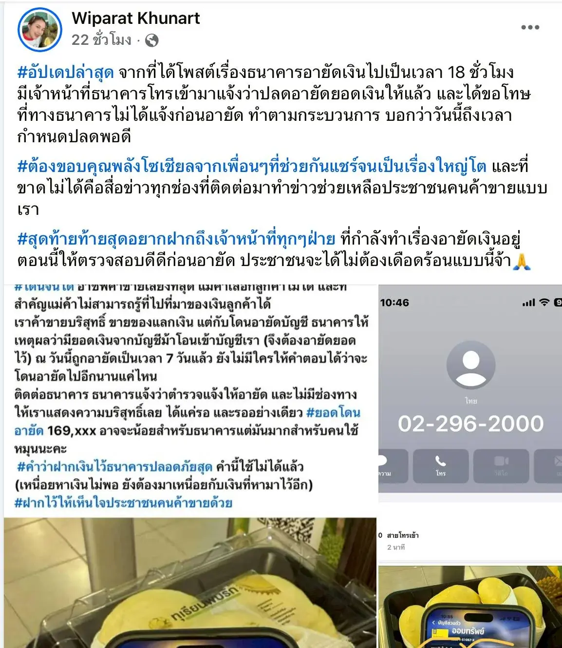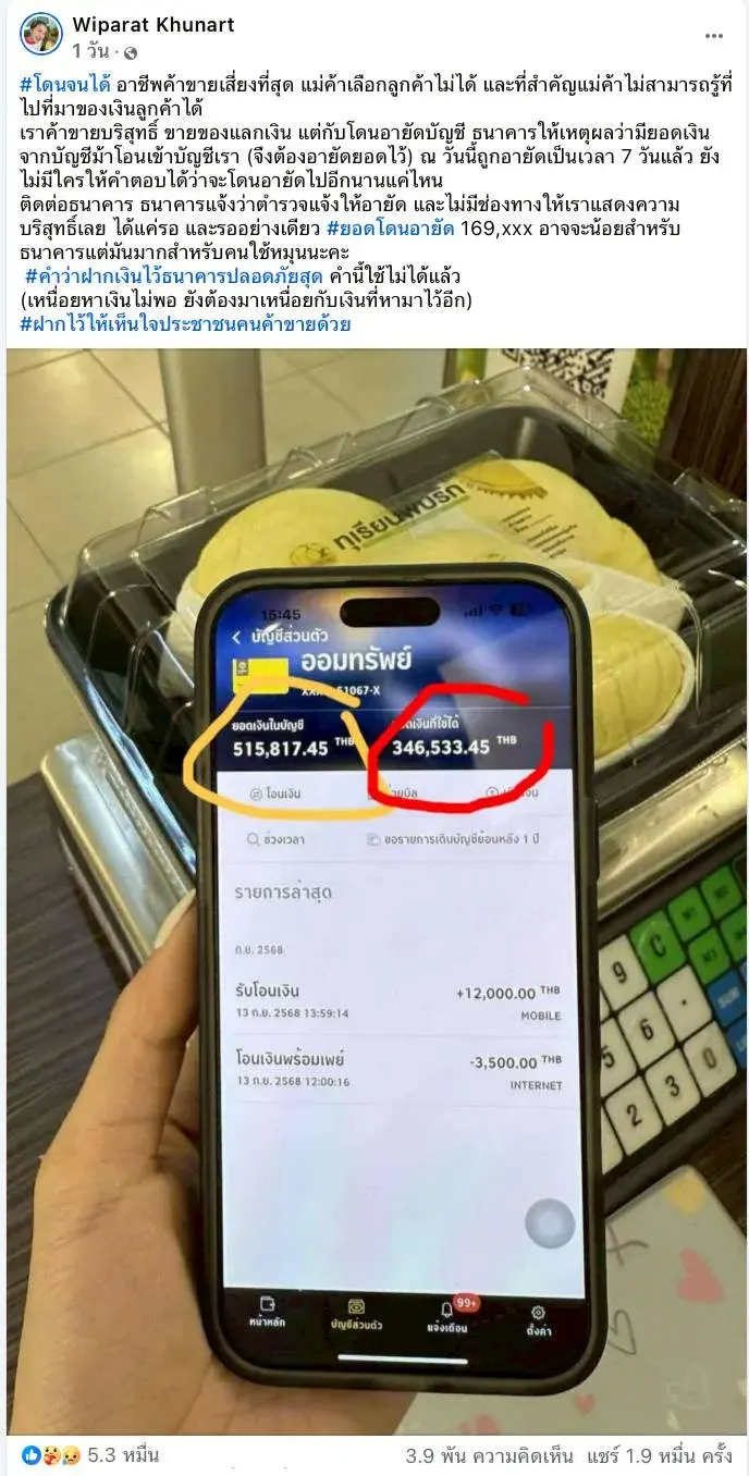 แม่ค้าทุเรียนโอด ถูกอายัดบัญชี 1.6 แสนบาท หลังเงินจากบัญชีม้าโอนเข้า – ธนาคารอ้างทำตามขั้นตอน ตำรวจสั่งอายัด แต่ไร้ช่องทางพิสูจน์ความบริสุทธิ์ จนโซเชียลช่วยกดดันปลดอายัดได้ทันที
