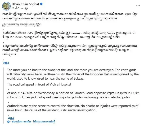 เหตุการณ์ ถนนทรุดตัวหน้าวชิรพยาบาล จนเกิดหลุมยุบขนาดใหญ่ลึกถึง 50 เมตร กลายเป็นข่าวใหญ่ที่ไม่ได้สะท้อนเพียงปัญหาภายในประเทศไทย แต่ยังถูกสื่อเพื่อนบ้านอย่าง Khmer Times ของกัมพูชา นำเสนอและได้รับความสนใจจากประชาชนกัมพูชาจำนวนมาก