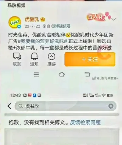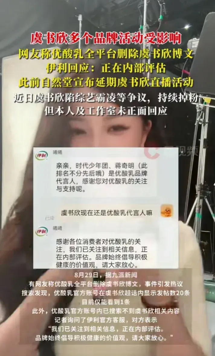 จากรายงานเมื่อวันที่ 29 สิงหาคม พบว่า บัญชีทางการของ(优酸乳)เครื่องดื่มนมเปรี้ยวพร้อมดื่ม หรือโยเกิร์ตดื่ม รสผลไม้ต่าง ๆที่เคยโพสต์ภาพและโฆษณาที่เกี่ยวข้องกับอวี๋ซูซินมากกว่า 20 โพสต์ ปัจจุบันถูกลบออกจนเหลือเพียงโพสต์เดียวเท่านั้น