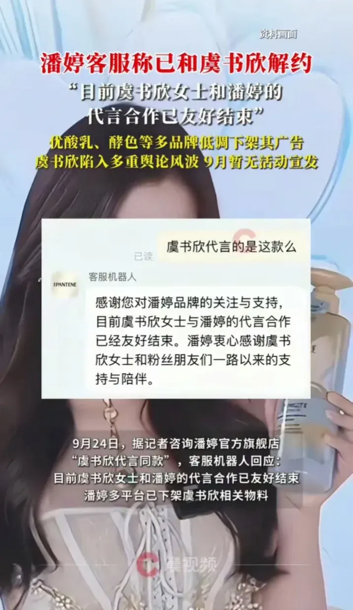 โดยหนึ่งในข่าวใหญ่ที่กลายเป็นประเด็นร้อนคือการที่ แชมพูแพนทีน (Pantene) ได้ประกาศยุติสัญญากับอวี๋ซูซินอย่างเป็นทางการ พร้อมลบสื่อโฆษณาที่เกี่ยวข้องออกจากแพลตฟอร์มต่าง ๆ แบบเงียบ ๆ นอกจากนี้ ยังมีการรายงานเพิ่มเติมว่า โยเกิร์ตดื่ม, 优酸乳, อีลี่ เเบรด์นม(伊利) และแบรนด์อื่น ๆ ได้ “ลดระดับความร่วมมือ” โดยถอดโฆษณาที่มีเธอออกจากหน้าเพจอย่างไม่เป็นทางการ