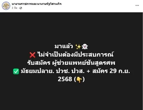 เมื่อวันที่ 28 ก.ย.68 ที่ผ่านมา ทางเพจ หางานราชการและหางานรัฐวิสาหกิจ ได้โพสต์ประกาศรับสมัครงาน พร้อมกับระบุข้อความว่า “มาแล้ว ไม่จำเป็นต้องมีประสบการณ์ รับสมัคร ผู้ช่วยแพทย์ชันสูตรศพ มัธยมปลาย. ปวช. ปวส. + สมัคร 29 กันยายน” ทั้งนี้หลังจากโพสต์ไปไม่นาน ก็ได้กลายเป็นกระแสไวรัลไปทั่วโลกโซเชียลเลยทีเดียว