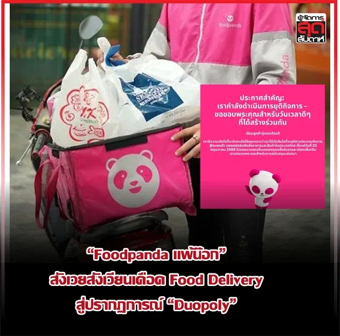 "Foodpanda" ประกาศอำลาสังเวียนธุรกิจ Food Delivery ในประเทศไทย หลังสะสมผลขาดทุนกว่า 13,000 ล้านบาทตลาดเวลา 5 ปี โดยยุติการให้บริการเมื่อวันที่ 21 พฤษภาคม ที่ผ่านมา การปิดฉากครั้งนี้นับเป็นการเปลี่ยนแปลงภูมิทัศน์ครั้งใหญ่ของตลาด ส่งผลให่กสนแช่งเหลือเพียง สองผู้เล่นหลักอย่าง "Grab" และ "Line Man"ที่กำลังก้าวเข้าสู่การผู้ขาดและมีอำนาจเหนือตลาด และมีโครงสร้างตลาดแบบ Duopoly อย่างชัดเจน ย้อนกลับไปกลางปี พ.ศ. 2567 ตลาดเคยสั่นสะเทือนมาแล้วจากการปิดตัวลงของ Robinhood ภายใต้ SCBX หลังเผชิญการขาดทุนต่อเนื่องกว่า 5,565 ล้านบาท และปิดดีลขายหุ้นให้กลุ่มยิบอินซอย ด้วยเหตุนี้ จึงทำให้สมรภูมิการแข่งขันที่เคยมี 4 แพลตฟอร์มหลัก (Grab, LINE MAN, Foodpanda และ Robinhood) ค่อย ๆ ลดลงเหลือเพียงสองรายสำคัญในปัจจุบัน