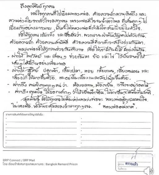 อดีตหลวงพ่ออลงกตเขียนจดหมายถึงลูกศิษย์จากในเรือนจำ
