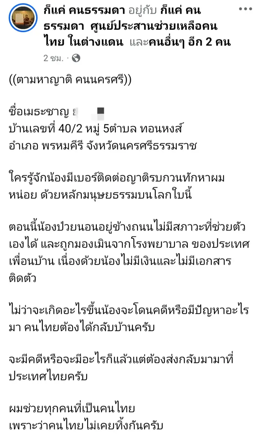 วันที่ 7 ตุลาคม 2568 ผู้สื่อข่าวรายงานว่า จากกรณีเฟสบุ๊คเจ้าหน้าที่ศูนย์ประสานช่วยเหลือคนไทยในต่างแดน โพสต์ภาพและข้อความระบุตามหาญาติคนไทยรายหนึ่งชื่อนายเมธาชาญ หรือ มีน อายุ 24 ปี ชาว อ.พรหมคีรี จ.นครศรีธรรมราช ตกระกำลำบากนอนหน้าอาคารพาณิชย์แห่งหนึ่ง ในประเทศกัมพูชา