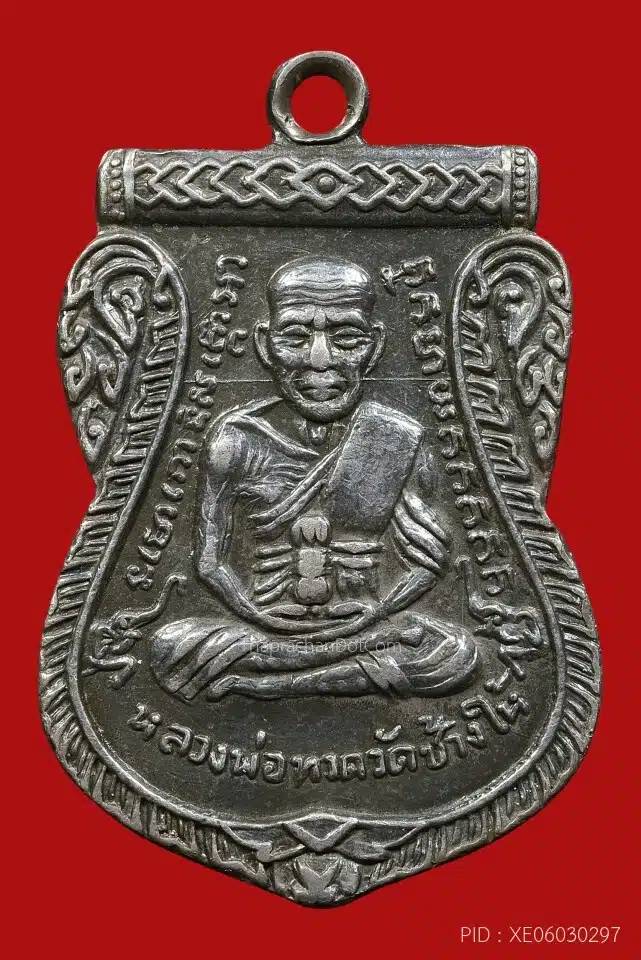 เป็นรูปหลวงปู่ทวดนั่งขัดสมาธิเต็มองค์ มีอักษรอักขระจารึกโดยรอบ ข้างซ้ายและขวาขององค์หลวงปู่มีรูป “ช้าง” ซึ่งสื่อถึง “วัดช้างให้” อันเป็นวัดประจำของหลวงปู่