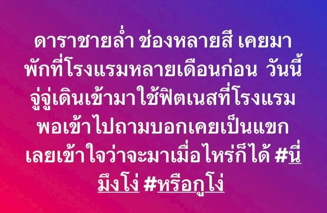 ดราม่ากลางวงการ! พนักงานโรงแรมงงหนัก ดาราชายหุ่นล่ำสังกัดช่องหลายสี โผล่มาใช้ฟิตเนสฟรี อ้าง “เคยเป็นแขกเก่า” จนโซเชียลแซะสนั่น #นี่มึงโง่หรือกูโง่