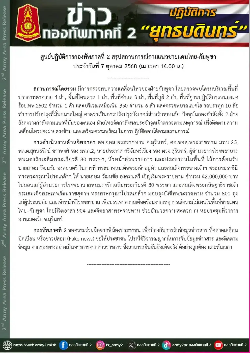 กองทัพภาคที่ 2 จึงเน้นย้ำให้ประชาชนติดตามข้อมูลจาก ช่องทางราชการอย่างเป็นทางการเท่านั้น เช่น ศูนย์ประชาสัมพันธ์ของกองทัพภาคที่ 2 หรือกรมประชาสัมพันธ์ เพื่อป้องกันความเข้าใจผิดและผลกระทบทางสังคมที่อาจตามมา
