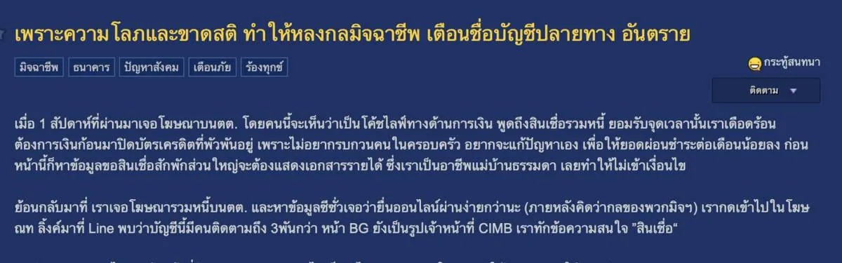 เจ้าของกระทู้ได้แจ้งความและพยายามอายัดบัญชี แต่คดียังไม่มีความคืบหน้า ส่งผลให้เธอโพสต์เรื่องราวเพื่อเป็น อุทาหรณ์เตือนภัยผู้อื่นไม่ให้ตกเป็นเหยื่อเหมือนเธอ