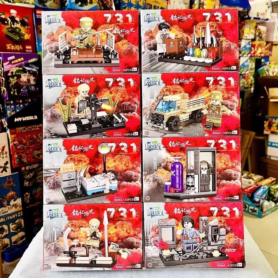 ชุดของเล่นชิ้นนี้บรรจุในกล่องขนาดเล็ก 8 กล่อง แต่ละกล่องมีข้อความว่า "จดจำประวัติศาสตร์" เพื่อส่งเสริมการศึกษาเกี่ยวกับความรักชาติ การรู้แจ้งทางอารมณ์ โดนตัวของเป็นจะมีทั้งทหาร แพทย์ และ คนจีนที่ถูกจับมาทดลอง ซึ่งตอนแรกก็ขายดีเป็นเทน้ำเทท่า แต่ในภายหลังเมื่อเรื่องถูกทราบไปถึง ภาครัฐ ก็ได้ออกมาประกาศให้ของเล่นชุดดังกล่าว เป็นของผิดกฎหมาย จึงทำให้ของเล่นชุดดังกล่าว กลายเป็นของเล่นหายาก และ มีราคาแพงมากๆ