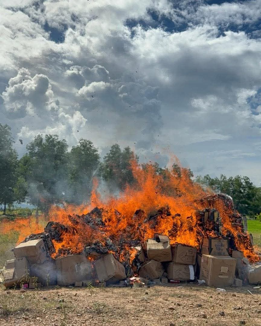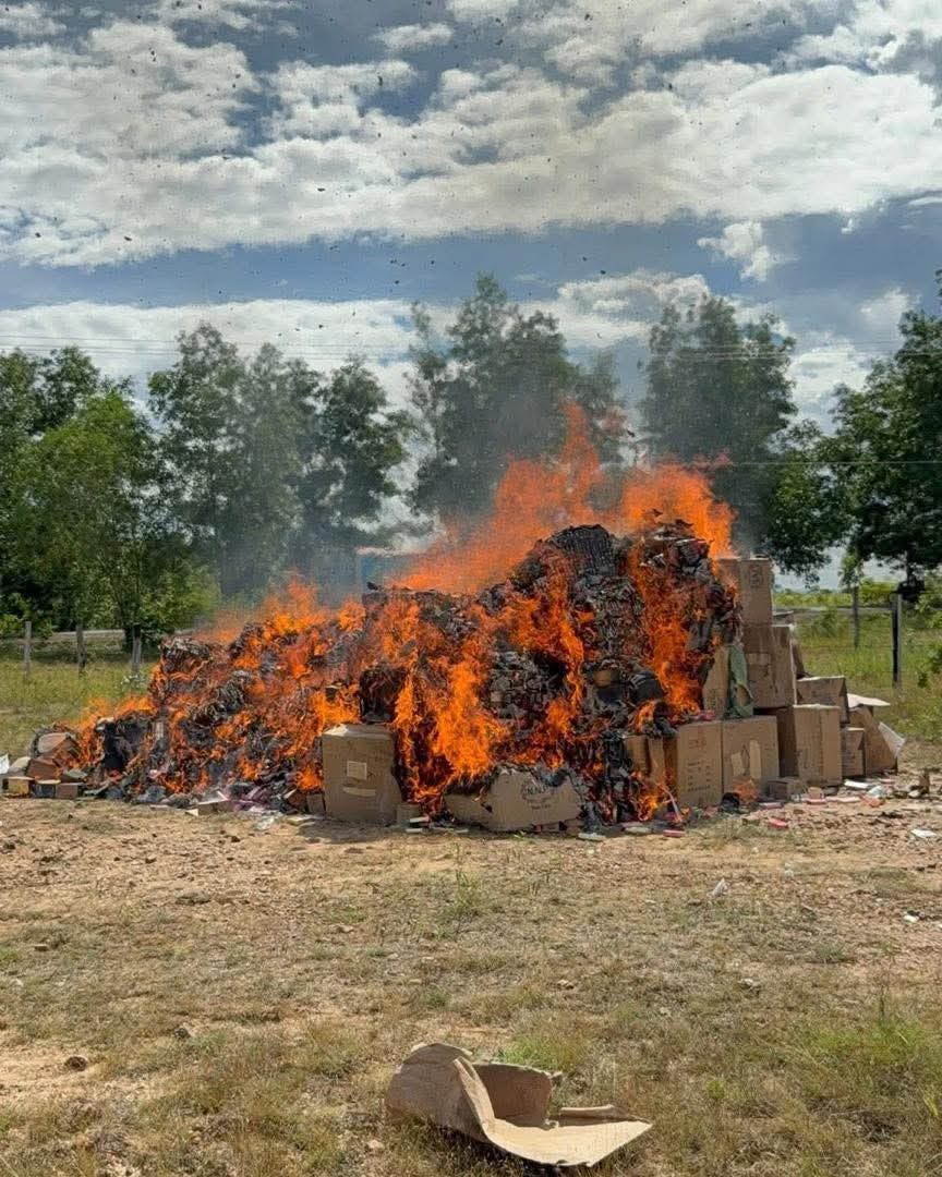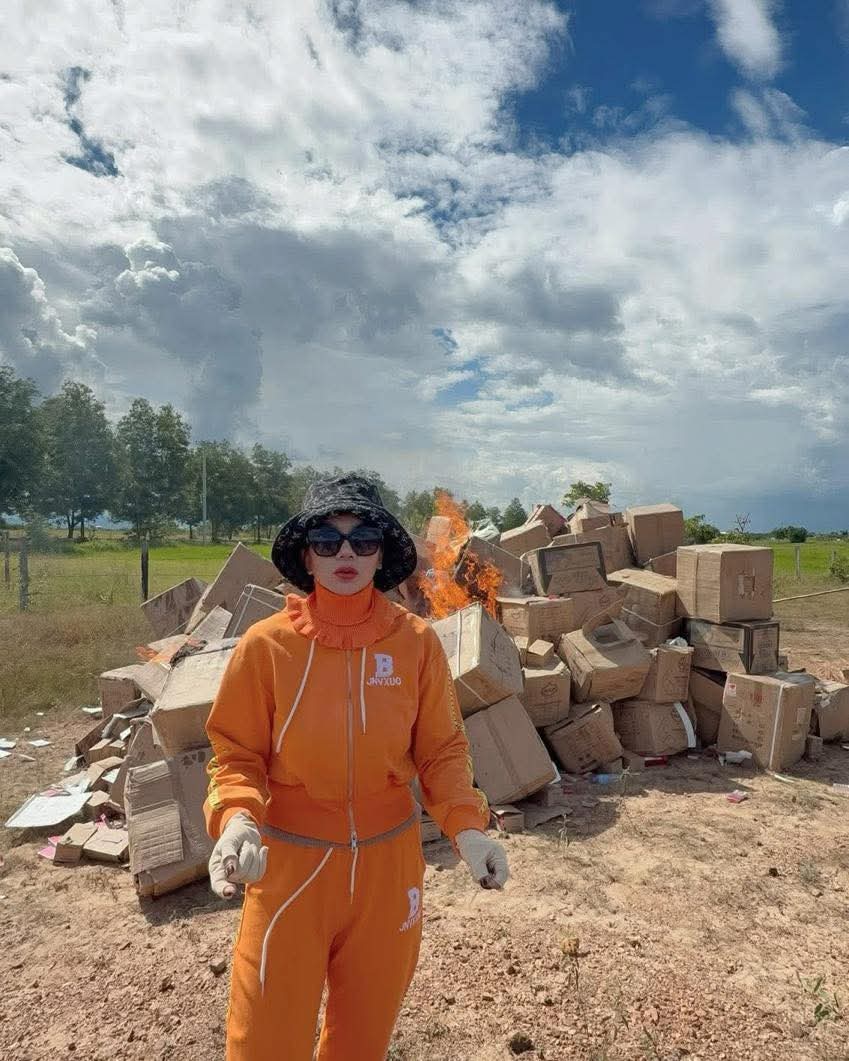 Sana Try อินฟลูชื่อดังวงการเครื่องสำอางกัมพูชา โชว์เผาสินค้าไทย โดยเจ้าตัวระบุว่าที่เผาคือ 60% ของสินค้าไทยที่สต๊อกไว้เพื่อจำหน่าย เช่น แป้งพับ สกินแคร์ ลิปสติก ครีม และอื่นๆ