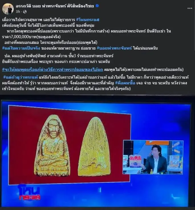 โดยเจ้าตัวโพสต์ข้อความพร้อมประกาศอย่างชัดเจนว่า หากเหรียญหลวงพ่อทวดปี 05 ที่หนุ่ม กรรชัยนำมาโชว์เป็นของแท้ตามมาตรฐาน เขายินดี “รับเช่าในราคา 7 ล้านบาททันที” ขอดูองค์จริงเท่านั้น!