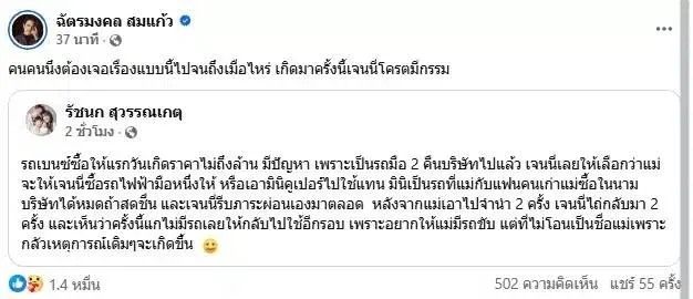 โดยยิวได้แชร์โพสต์ของเจนนี่ที่พูดถึงเรื่องรถที่แม่เกตุเอาไปจำนำ แล้วเธอต้องเป็นคนไถ่กลับคืน พร้อมเขียนแคปชันสั้น ๆ แต่เต็มไปด้วยความหมายว่า