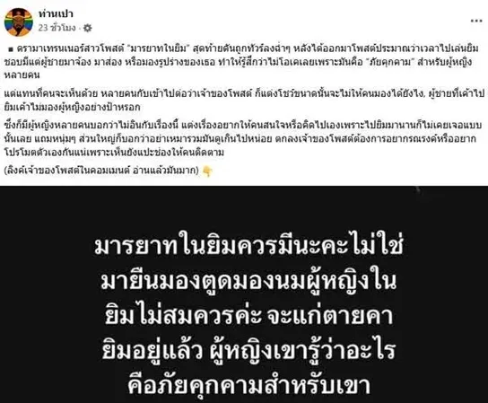 เมื่อวันที่ 10 ต.ค.68 มีการแชร์โพสต์หนึ่งว่อนโลกโซเชียล หลายคนออกมาวิพากษ์วิจารณ์กันไปต่างๆ นานา หลังจากเพจดังอย่าง "ท่านเปา" ได้แชร์โพสต์ของเทรนเนอร์สาวรายหนึ่ง ที่ออกมาพูดเรื่องมารยาทในยิม โดยมีข้อความประมาณว่าเวลาเข้ายิมเพื่อออกกำลังกายมีแต่ผู้ชายมาจ้อง มาส่อง หรือมองแต่รูปร่างเธอ ทำให้รู้สึกว่าไม่ค่อยปลอดภัยและไม่โอเคเลย เพราะมันคือภัยคุกคามสำหรับผู้หญิงหลายคน