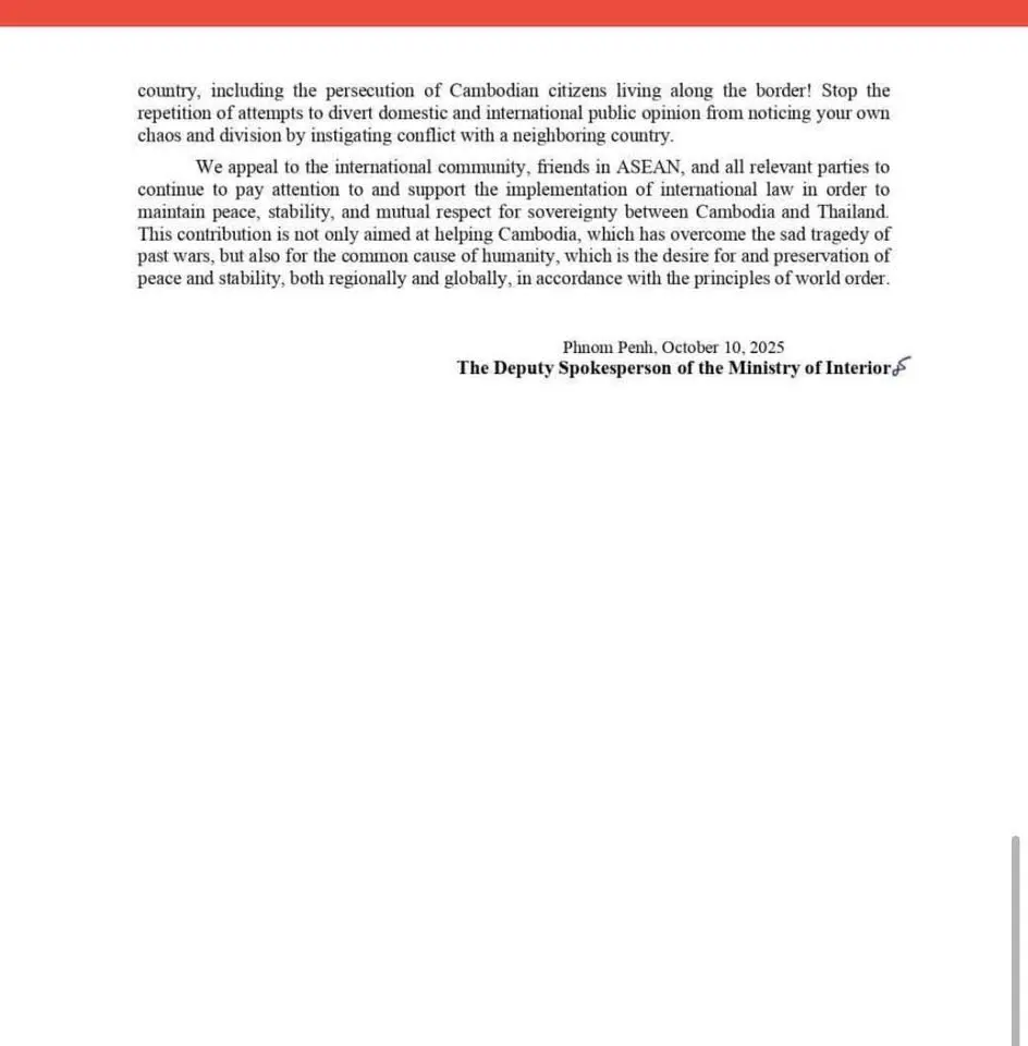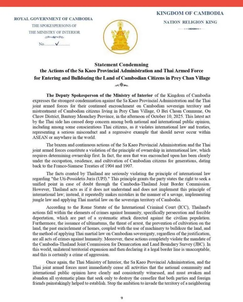 Fresh News เผยแพร่แถลงการณ์ของกระทรวงมหาดไทยของกัมพูชา ระบุว่า รองโฆษกกระทรวงมหาดไทยแห่งราชอาณาจักรกัมพูชา ออกแถลงการณ์ประณามอย่างรุนแรงต่อองค์การบริหารส่วนจังหวัดสระแก้ว และกองทัพไทย ที่ยังคงแผ้วถางที่ดินอันเป็นการละเมิดอธิปไตยของกัมพูชา และข่มเหงรังแกชาวกัมพูชาที่อาศัยอยู่ในหมู่บ้านเปรยจัน ตำบลโอเบยชอน อำเภอโอชรอฟ จังหวัดบันเตียเมียนเจย เมื่อบ่ายวันที่ 10 ตุลาคม 2568