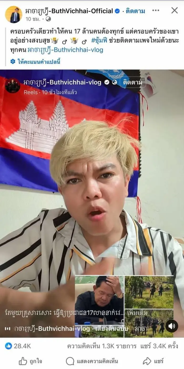 อินฟลูเขมร ปลุกมวลชนขับสมเด็จฮุนเซน บอกว่าทำไมคนเขมร 17 ล้านคน ต้องมาเดือดร้อนเพราะตระกูลเดียว