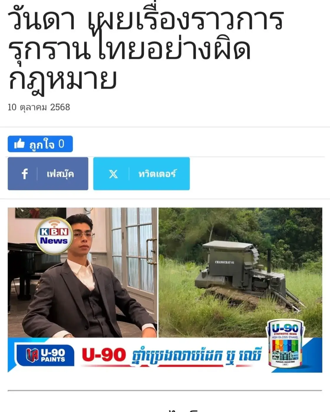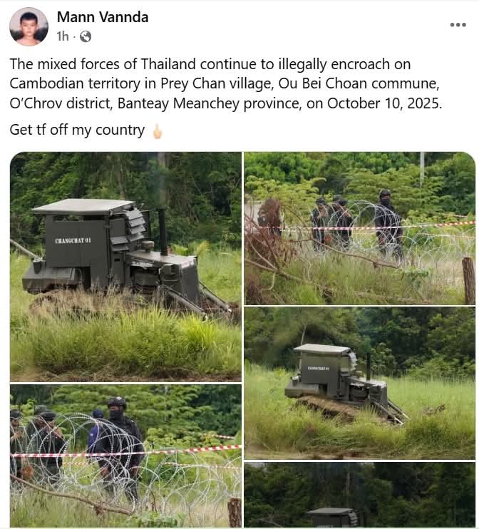 “กองกำลังผสมของไทยยังคงยึดครองดินแดนกัมพูชาอย่างผิดกฎหมายในหมู่บ้านเปรยจัน ตำบลโอเบยชอน อำเภอโอชรอ จังหวัดบันเตียเมียนเจย เมื่อวันที่ 10 ตุลาคม 2568”และทิ้งท้ายว่า “ออกจากประเทศของฉัน”
