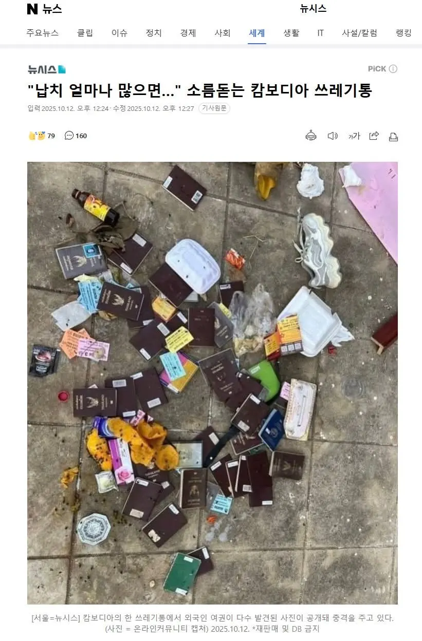 12 ต.ค. - ขณะนี้โลกออนไลน์ของเกาหลีใต้กำลังให้ความสนใจกับภาพถ่ายที่ถูกเผยแพร่โดยชาวเน็ต ซึ่งแสดงให้เห็นว่ามี หนังสือเดินทางสัญชาติไทยและสัญชาติอื่น ๆ อีกหลายเล่ม ถูกทิ้งอยู่ในถังขยะในประเทศกัมพูชา
