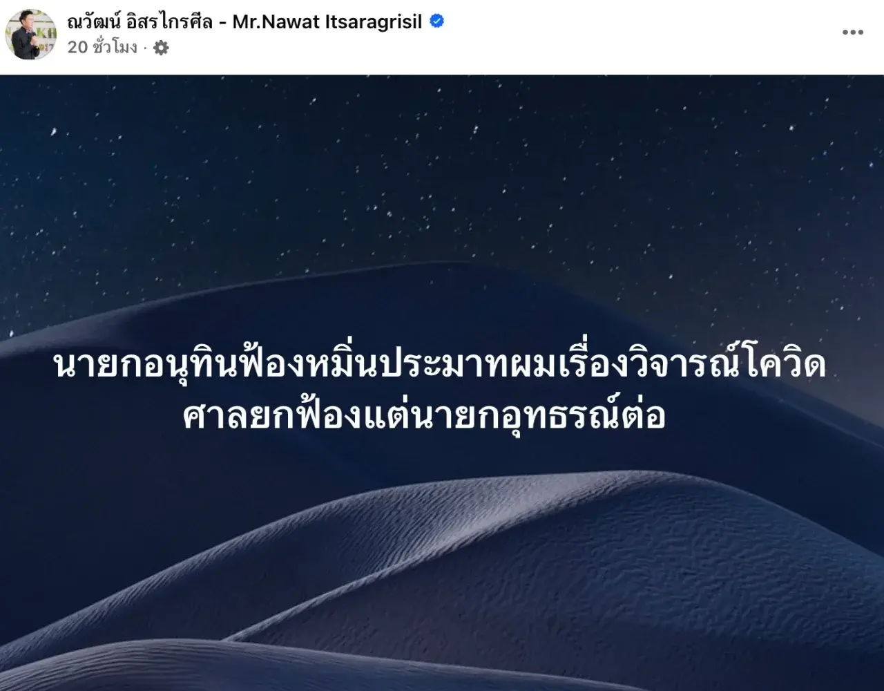 ได้โพสต์ผ่านเฟซบุ๊กส่วนตัว ณวัฒน์ อิสรไกรศีล – Mr.Nawat Itsaragrisil ว่านายอนุทิน ชาญวีรกูล นายกรัฐมนตรีถูกฟ้องคดีหมิ่นประมาทจากการวิจารณ์โควิด-19 แม้ว่าศาลชั้นต้นจะยกฟ้อง แต่ฝ่ายตรงข้ามยังเลือกที่จะดำเนินการทางกฎหมายต่อในชั้นอุทธรณ์ “นายกอนุทินฟ้องหมิ่นประมาทผมเรื่องวิจารณ์โควิด ศาลยกฟ้องแต่นายกอุทธรณ์ต่อ”
