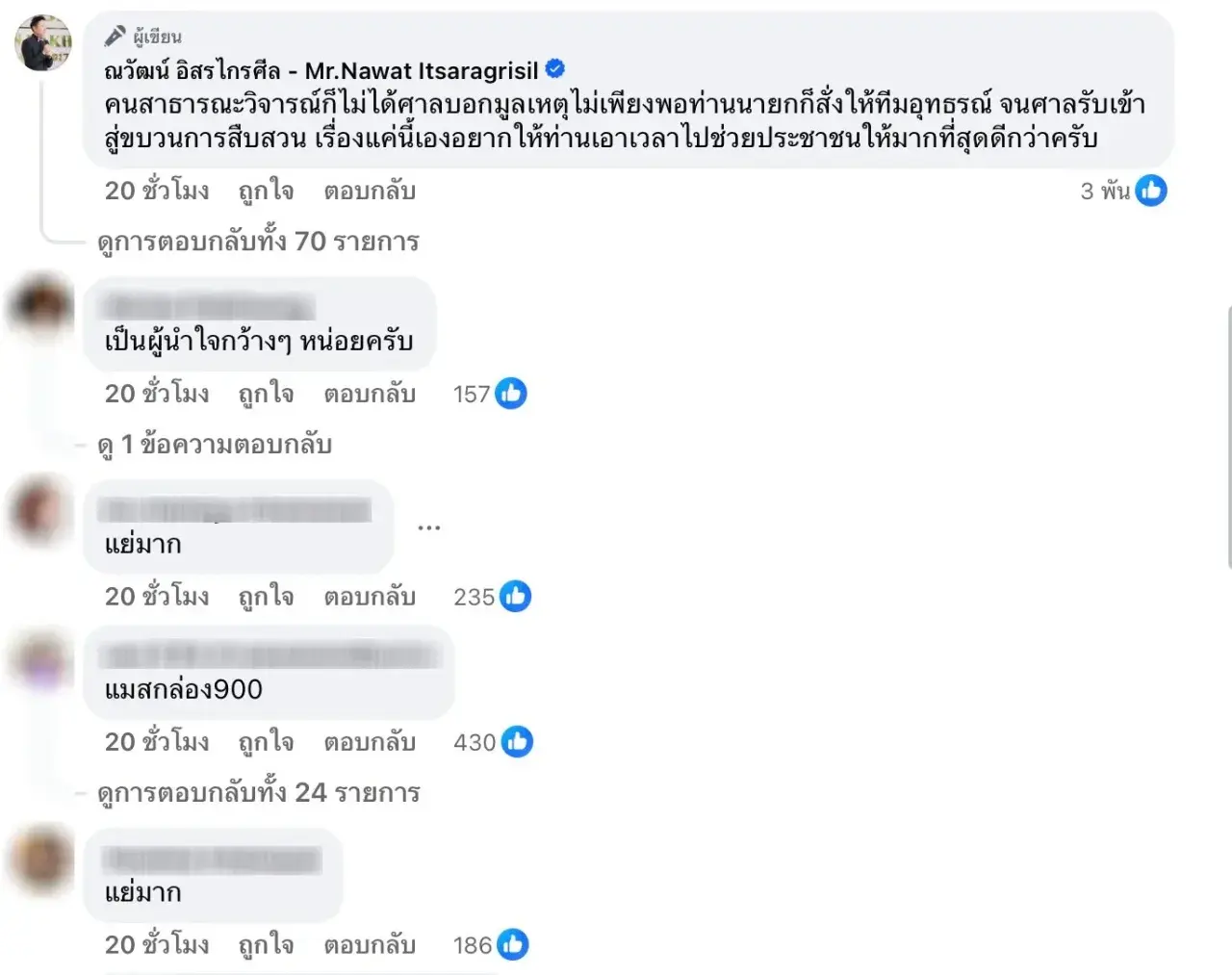 นอกจากนี้ บอสณวัฒน์ยังได้แสดงความคิดเห็นในคอมเมนต์ว่า “คนสาธารณะวิจารณ์ก็ไม่ได้ ศาลบอกมูลเหตุไม่เพียงพอ ท่านนายกก็สั่งให้ทีมอุทธรณ์ จนศาลรับเข้าสู่กระบวนการสืบสวน เรื่องแค่นี้เอง อยากให้ท่านเอาเวลาไปช่วยประชาชนให้มากที่สุดดีกว่าครับ” อย่างไรก็ดี ชาวเน็ตก็ออกมาแสดงความคิดเห็นหลากหลาย บางคนรู้สึกตกใจกับเรื่องนี้