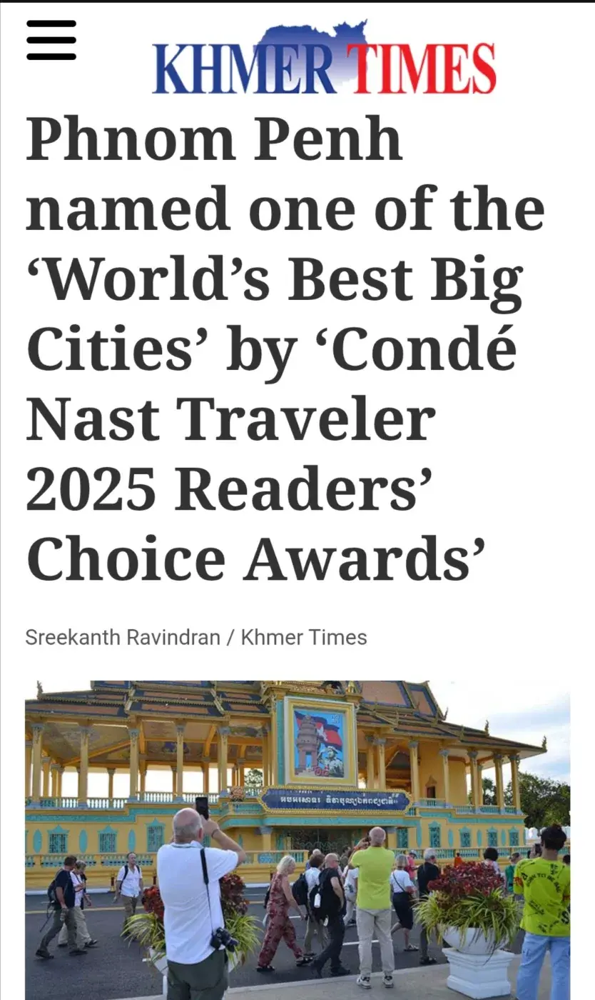 สำนักข่าวขแมร์ไทม์สของกัมพูชารายงานข่าวดีว่า กรุงพนมเปญ เมืองหลวงของประเทศกัมพูชา ได้รับการจัดอันดับให้เป็น เมืองใหญ่ที่ดีที่สุดอันดับที่ 10 ของโลก (Best Big Cities 2025) จากการสำรวจความคิดเห็นผู้อ่านในโครงการ “Reader’s Choice Awards 2025” ของนิตยสารท่องเที่ยวชื่อดังระดับโลก Condé Nast Traveller