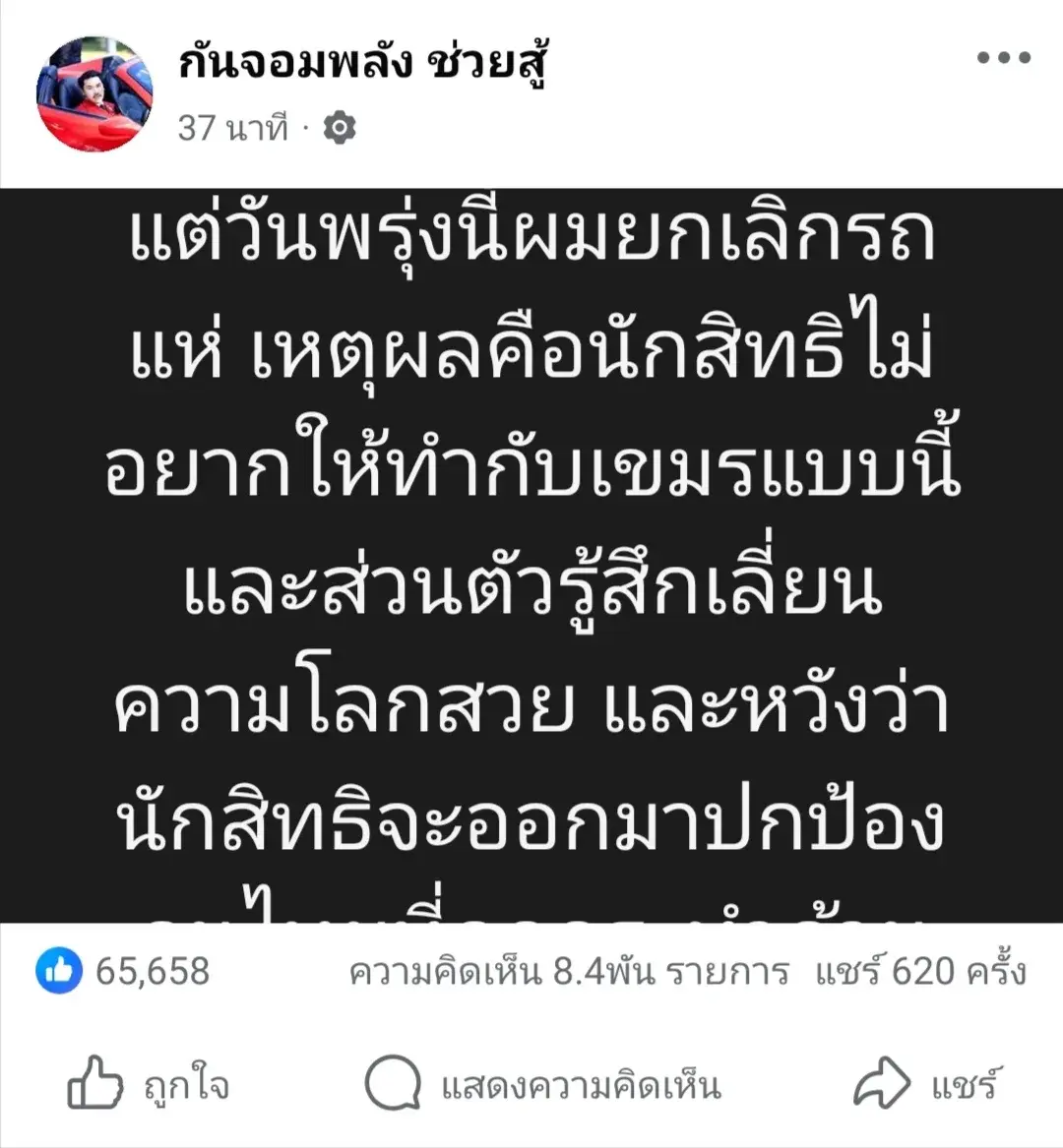 ทั้งนี้ ก่อนหน้านี้ “กัน จอมพลัง” มีแนวโน้มจะจัดขบวนรถแห่เพื่อแสดงพลังเชิงสัญลักษณ์ หลังเกิดกรณีความขัดแย้งระหว่างคนไทยและแรงงานกัมพูชาในพื้นที่ชายแดน แต่เมื่อเสียงวิพากษ์วิจารณ์ดังขึ้น โดยเฉพาะจากภาคประชาสังคมและนักสิทธิ เขาจึงประกาศยุติการเคลื่อนไหวในรูปแบบดังกล่าวทันที