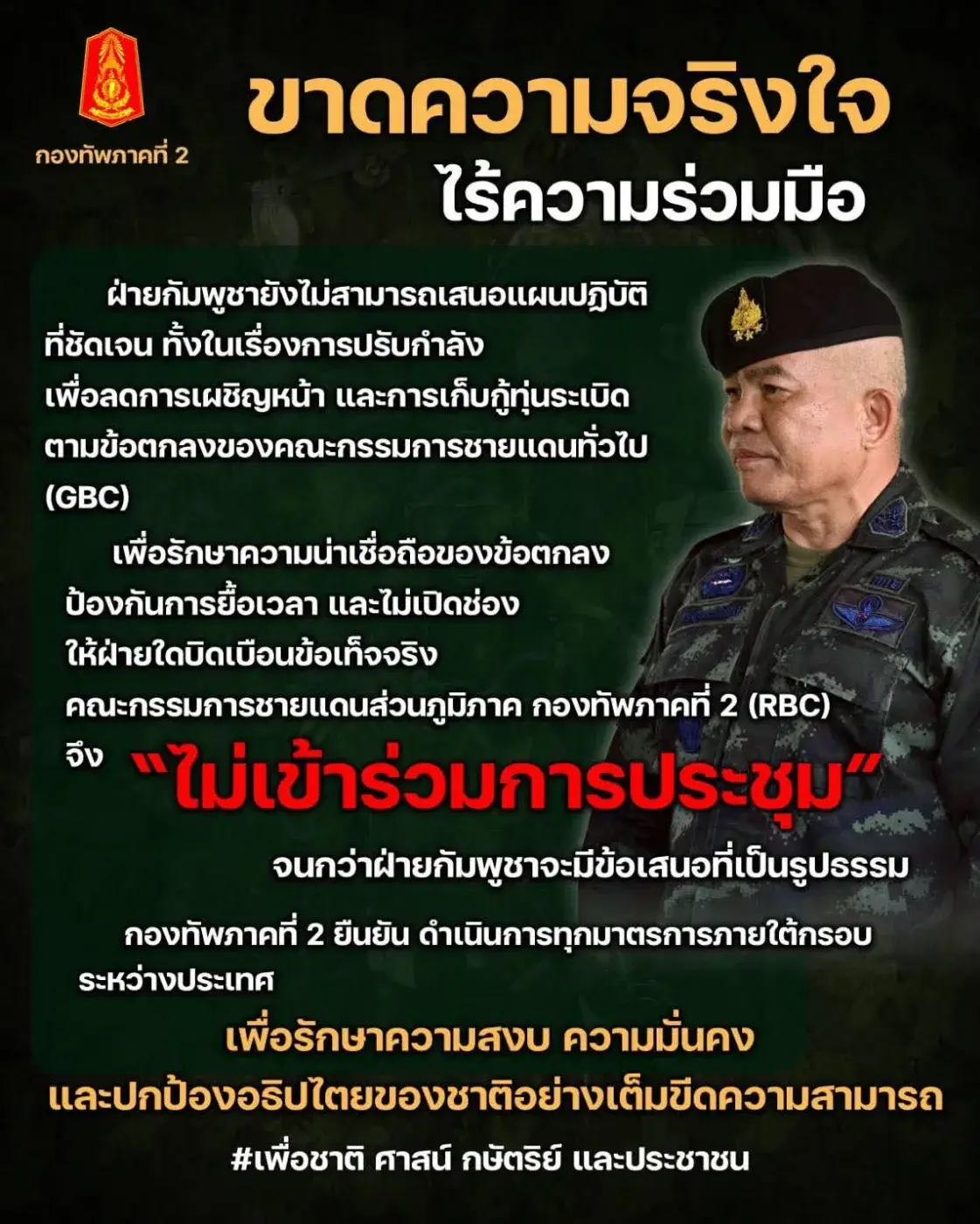 กองทัพภาคที่ 2 ยันชัด! หากภูมิภาคทหารที่ 4 ไม่ร่วมมือจัดทำแผนปรับกำลัง–แผนเก็บกู้ทุ่นระเบิด จะไม่สามารถเข้าร่วมประชุม RBC ได้