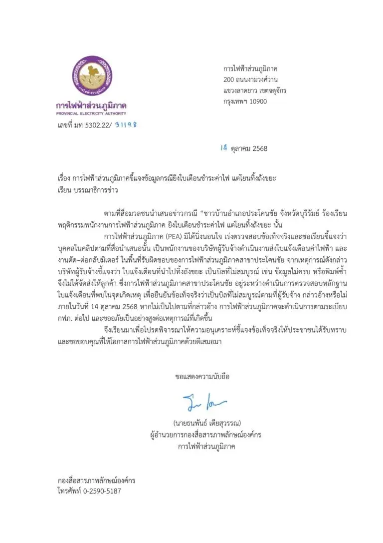 ต่อมา การไฟฟ้าส่วนภูมิภาค (PEA) ได้ออกมาชี้แจงว่า บุคคลในคลิปนั้นเป็น “พนักงานของบริษัทผู้รับจ้าง” ซึ่งมีหน้าที่ส่งใบแจ้งเตือนค่าไฟและดำเนินงานเกี่ยวกับมิเตอร์ในพื้นที่ โดยทางบริษัทแจ้งว่า บิลที่เห็นถูกนำไปทิ้งนั้นเป็น “ใบแจ้งเตือนที่ไม่สมบูรณ์” เช่น พิมพ์ซ้ำ หรือมีข้อมูลไม่ครบถ้วน จึงไม่ได้จัดส่งให้ลูกค้า