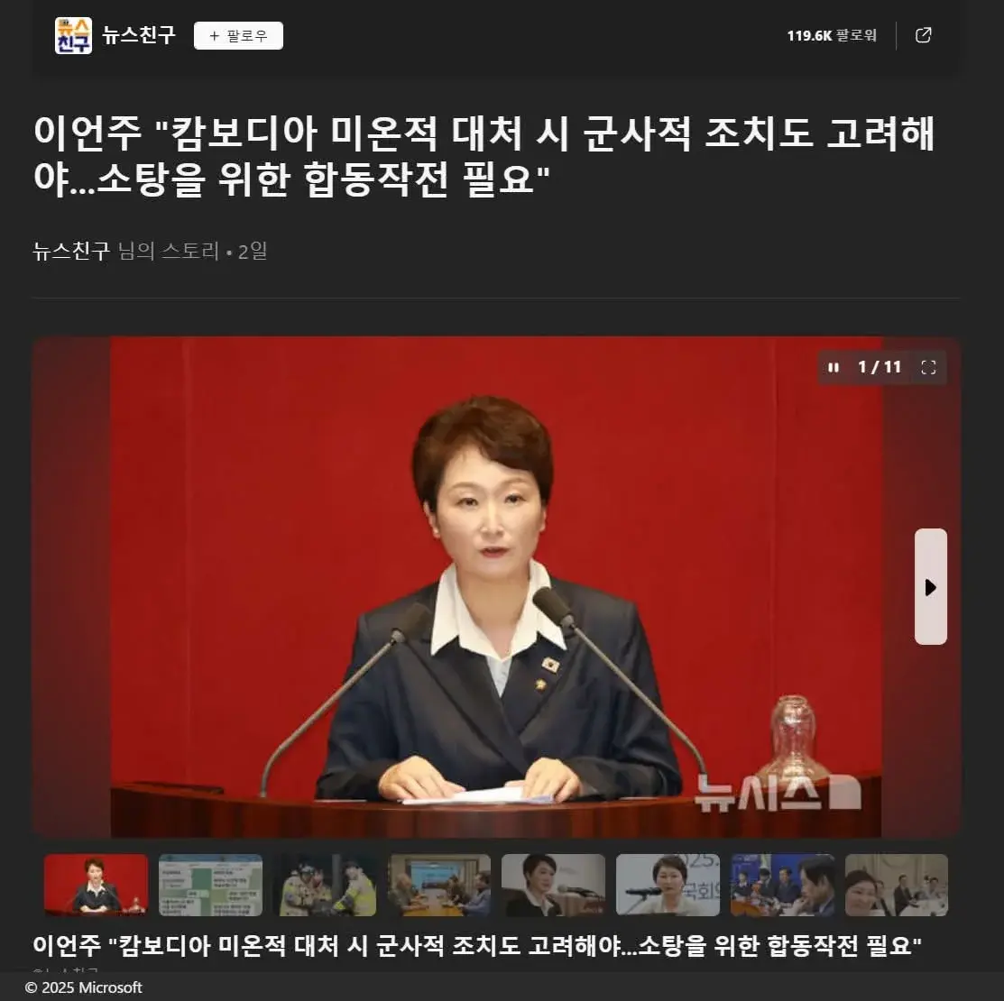 นาง อี อึนจู สมาชิกสภาสูงของพรรคประชาธิปัตย์ ถูกยกคำพูดว่า “เราต้องแสดงให้ประชาคมโลกเห็นว่าชาวเกาหลีจะถูกลงโทษอย่างเต็มที่สำหรับอาชญากรรมหรือการก่อการร้ายที่กระทำต่อพวกเขา” และเตือนว่าหากรัฐบาลกัมพูชาไม่ให้ความร่วมมือ ต้องพิจารณามาตรการทางทหารรวมถึงการช่วยเหลือตนเองเพื่อปกป้องพลเมือง ซึ่งคำพูดลักษณะนี้สะท้อนแรงกดดันทางการเมืองและความโกรธแค้นของสังคมเกาหลีใต้ต่อเหตุการณ์ในกัมพูชา (คำพูดนี้เป็นสาระที่ส.ส./ส.ว.บางคนเผยแพร่และถูกนำเสนอในวงสื่อ).