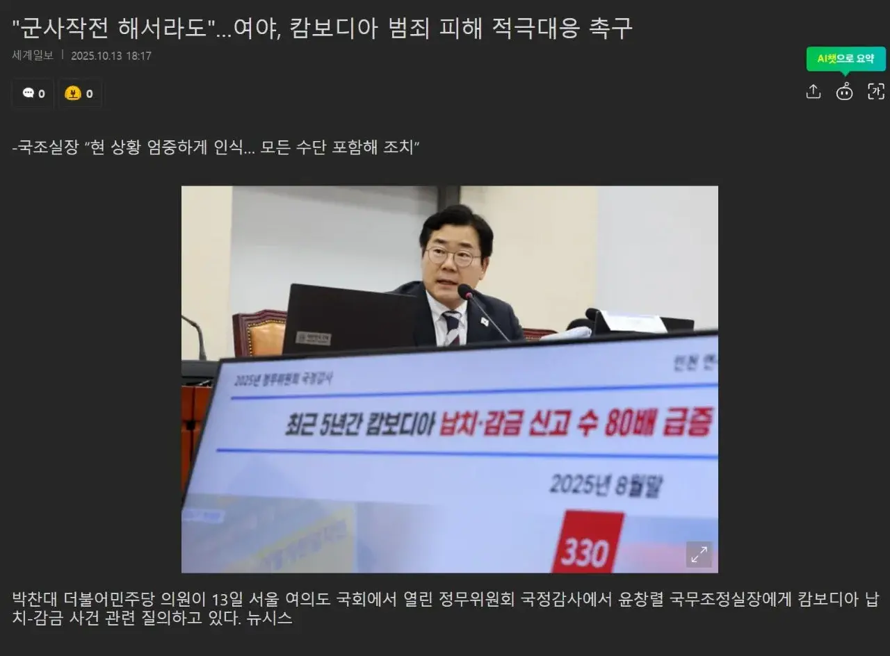 15 ตุลาคม 2568 — เหตุการณ์ความไม่ปลอดภัยต่อพลเมืองเกาหลีใต้ในกัมพูชาที่กำลังเป็นวิกฤต ส่งผลให้สมาชิกรัฐสภาและวุฒิสภาเกาหลีใต้ร่วมกันกดดันรัฐบาลให้ใช้ทุกมาตรการเพื่อคุ้มครองพลเมือง หลังมีรายงานชาวเกาหลีใต้สูญหายและตกเป็นเหยื่อแก๊งสแกมในกัมพูชาเป็นจำนวนมาก โดยรัฐบาลโซลประกาศจะ “เดินหน้าช่วยเหลือเต็มที่” และไม่ละเว้นการเอาผิดผู้เกี่ยวข้องทุกราย.