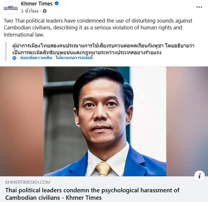 15 ตุลาคม 2568 — สื่อกัมพูชาชื่อดัง Khmer Times รายงานข่าวอ้างคำพูดของ นายกัณวีร์ สืบแสง สมาชิกสภาผู้แทนราษฎรไทย ซึ่งถูกนำเสนอในลักษณะที่เข้าข้างรัฐบาลพนมเปญ โดยระบุว่า ส.ส.รายนี้ได้ออกมาวิพากษ์การกระทำของฝ่ายไทยที่ “ใช้เสียงรบกวนต่อพลเรือนกัมพูชา” ตามแนวชายแดน ถือเป็น “การละเมิดสิทธิมนุษยชนและกฎหมายระหว่างประเทศอย่างร้ายแรง”