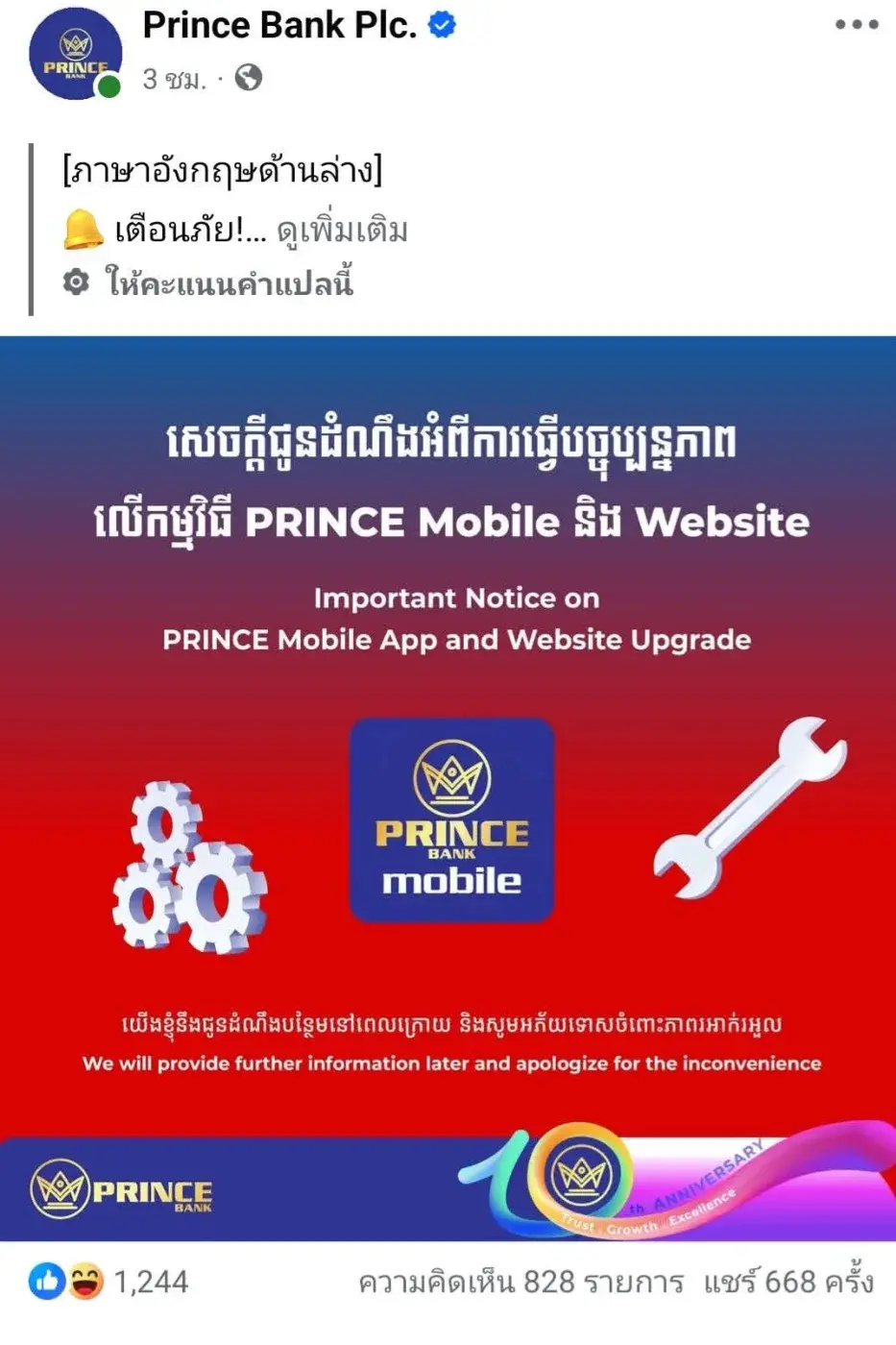 ก่อนหน้านี้ เพจของ Prince Bank เคยออกมาชี้แจงว่า “ระบบธนาคารขัดข้องชั่วคราว” หลังจากมีลูกค้าจำนวนมากร้องเรียนว่า ไม่สามารถถอนเงิน โอนเงิน หรือเข้าถึงบัญชีได้เลย ผ่านทั้งแอปพลิเคชันและตู้เอทีเอ็ม
