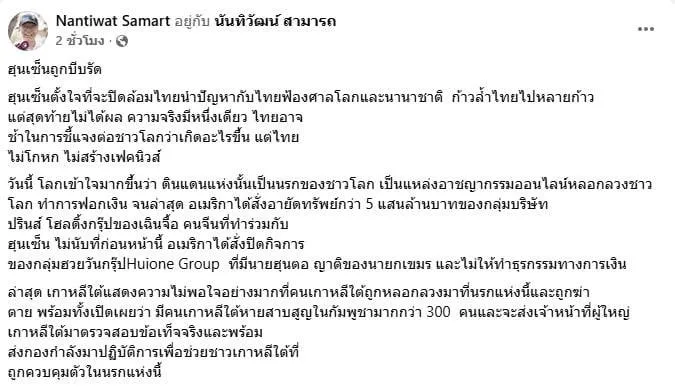 ล่าสุด นาย นันทิวัฒน์ สามารถ อดีตรองผู้อำนวยการสำนักข่าวกรองแห่งชาติ ได้ออกมาโพสต์วิเคราะห์ผ่านเฟซบุ๊กส่วนตัว ชี้ชัดว่าเหตุผลที่ “ฮุน เซน” เร่งสร้างความขัดแย้งกับไทยในเวลานี้ ไม่ใช่เพราะความขัดแย้งชายแดนหรือผลประโยชน์โดยตรง แต่เป็นเพราะ “เขากำลังถูกบีบรัดจากทุกทิศทาง” — ทั้งจาก สหรัฐอเมริกา ที่เพิ่งอายัดทรัพย์สินมูลค่ามหาศาลของเครือข่ายใกล้ชิด และจาก เกาหลีใต้ ที่ออกแถลงการณ์ขู่ส่งเจ้าหน้าที่และกองกำลังเข้าช่วยเหลือพลเมืองของตนที่ถูกกักขังในกัมพูชา