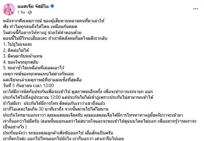 แต่สิ่งที่เกิดขึ้นหลังจากนั้นกลับไม่เป็นอย่างที่คิด เมื่อเวลาผ่านไปหลายเดือน รถยังไม่แล้วเสร็จ ติดต่ออู่ไม่ได้ มีคนแปลกหน้ามารับหน้าแทน และของบางอย่างในรถหายไป — มอสเจียเริ่มเอะใจ จึงโพสต์ขอความช่วยเหลือและขอให้คนที่เคยซ่อมกับอู่เดียวกันมาแชร์ประสบการณ์ ซึ่งหลายคนก็ออกมาคอนเฟิร์ม “โดนเหมือนกันหมด!”