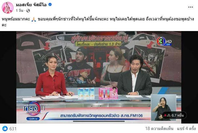 ภายหลังข่าวออกอากาศ มอสเจียได้โพสต์ภาพจากรายการ “เที่ยงวันทันเหตุการณ์” พร้อมข้อความว่า