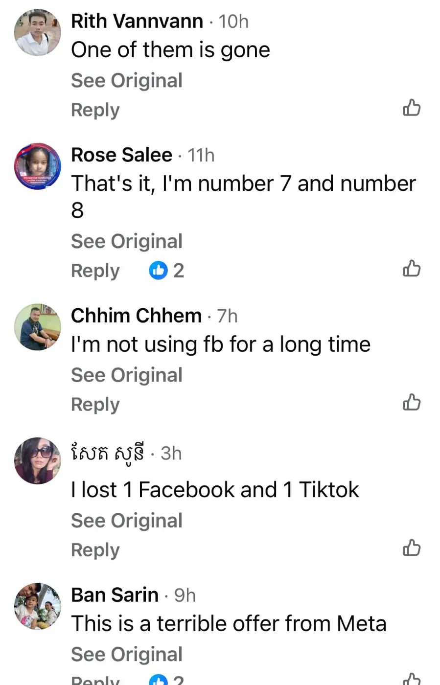 นอกจากนี้ ยังมีรายงานว่าชาวกัมพูชาบางรายถูกปิดบัญชีไปหลายแพลตฟอร์มรวมถึง TikTok ด้วย โดยบางคนถึงกับบ่นด้วยอารมณ์ที่ผสมผสานว่า "เจ็บปวดที่ทำอย่างนี้กับชาว กพช [กัมพูชา] เรารักสันติภาพ เราแค่ต้องการสันติภาพ" ซึ่งคำพูดนี้ไม่เพียงแต่สะท้อนความรู้สึกส่วนตัวเท่านั้น แต่ยังเป็นการอ้างอิงถึงวาทกรรมทางการเมืองเรื่องสันติภาพที่คุ้นเคยในประเทศ พร้อมกันนี้ก็เป็นการเสียดสีการถูกโจมตีในพื้นที่โลกออนไลน์จากบริษัทต่างชาติ การกระทำของ Meta ครั้งนี้จึงไม่เพียงเป็นเรื่องของการจัดการแพลตฟอร์ม แต่ยังเป็นภาพสะท้อนของความขัดแย้งระหว่างการควบคุมเนื้อหาของบริษัทเทคโนโลยีระดับโลกกับกระแสความเห็นและผลประโยชน์ในระดับท้องถิ่น.