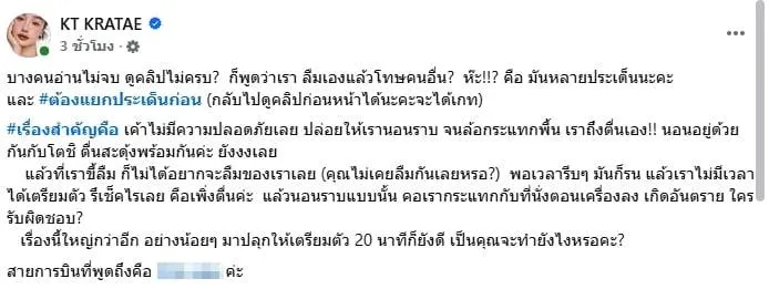กระแตเผยว่า “ตอนนั้นคือช็อกเลยค่ะ เรานอนราบอยู่เต็มที่ พอเครื่องแตะพื้นคอก็กระแทกกับที่นั่ง เจ็บมาก แล้วไม่มีใครมาปลุกหรือแจ้งอะไรเลย ถ้าเกิดอันตรายขึ้นใครจะรับผิดชอบ?”
